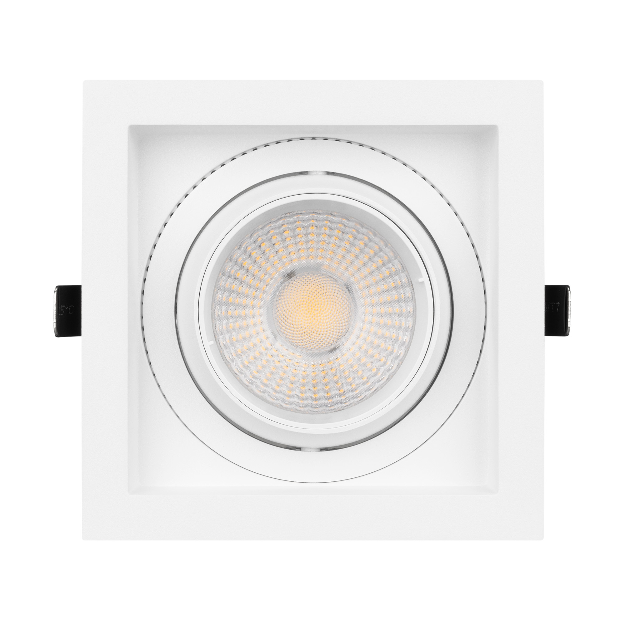 Встраиваемый карданный светильник. Мощность 30 Вт, св. поток 2650 лм, 89 лм/Вт, дневной 4000 K, CRI>92, угол 50°, напряжение питания 230 В. Белый корпус из алюминия, белая вставка, степень защиты IP20. Размер: длина 140 мм, ширина 140 мм, высота 125 мм. Монтаж встраиваемый, установочное отверстие: длина 120 мм, ширина 120 мм. Драйвер 24-42 В, 750 мА, пульсация <2%.
