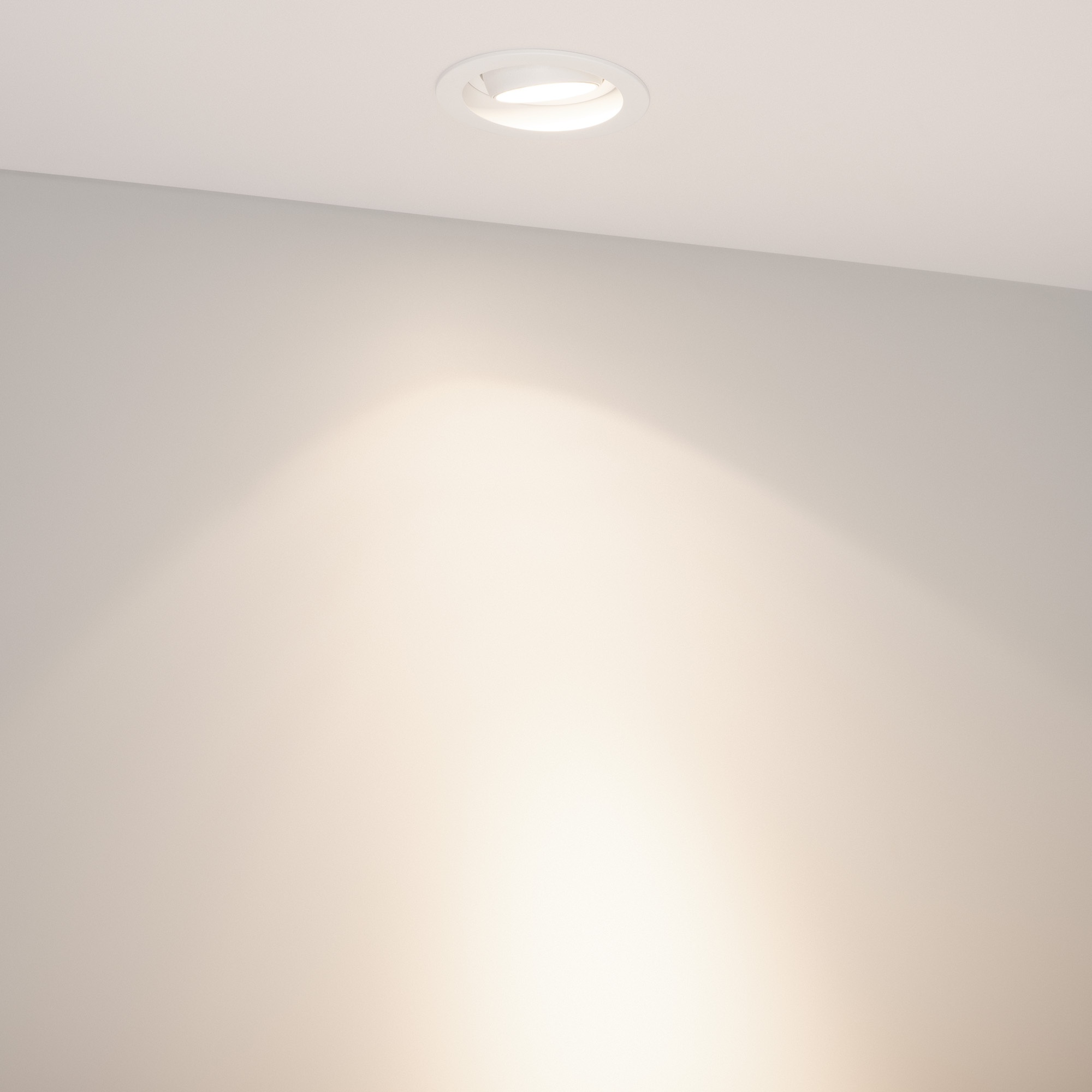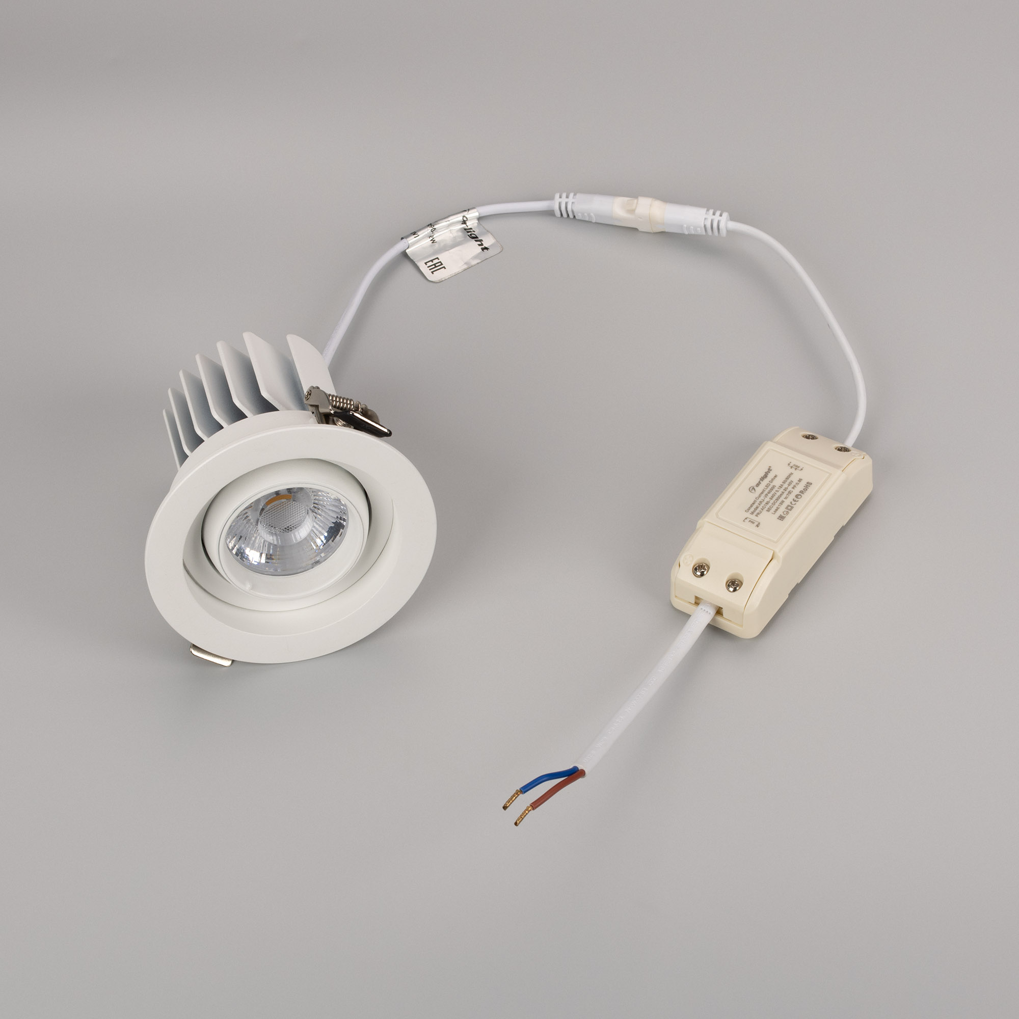 лм/Вт, дневной 4000 K, CRI>92, угол 20°, напряжение питания 230 В. Белый корпус из алюминия, белая вставка, степень защиты IP20. Размер: диаметр 90 мм, высота 80 мм. Монтаж встраиваемый, установочное отверстие: диаметр 75 мм. Драйвер 27-40 В, 300 мА, пульсация <2%.