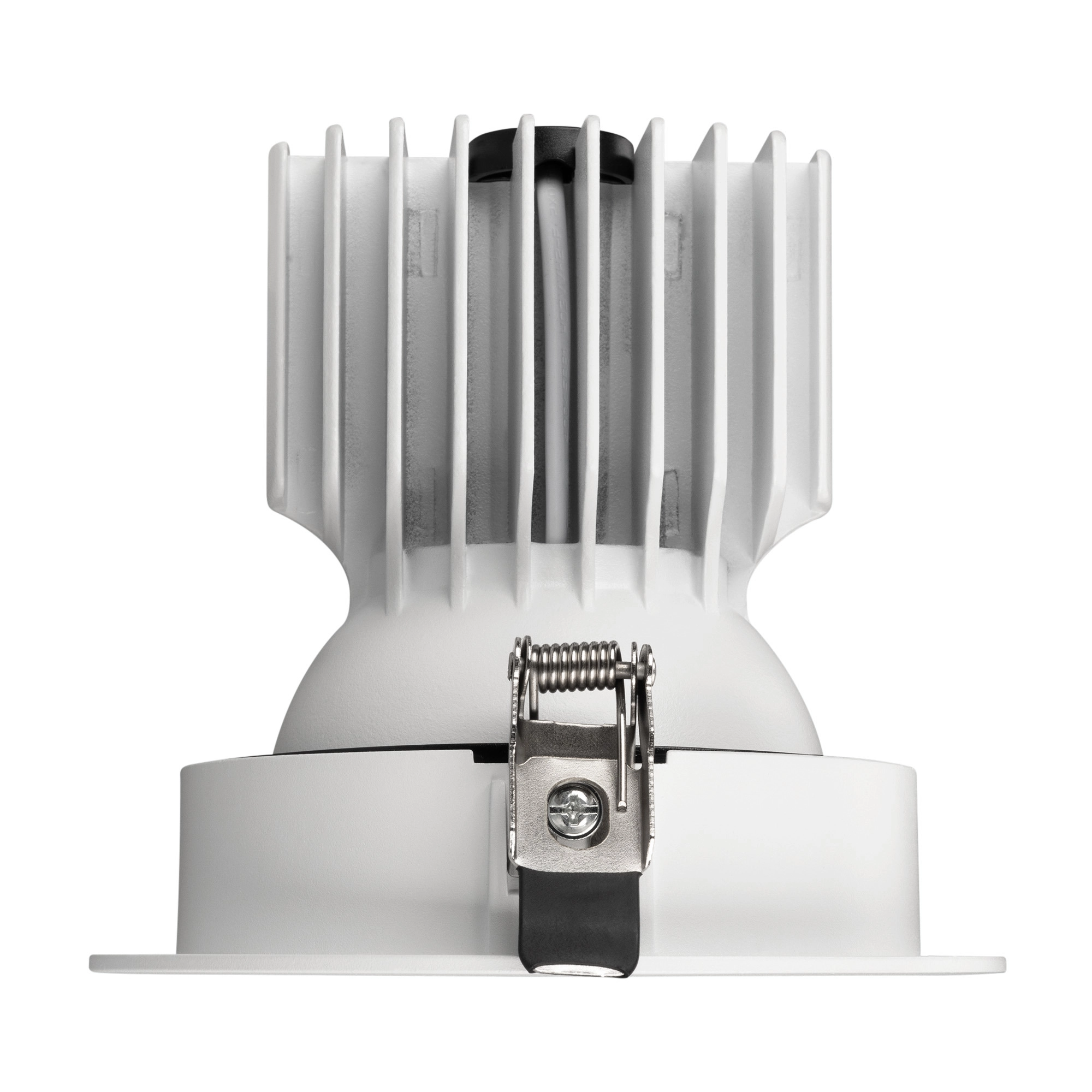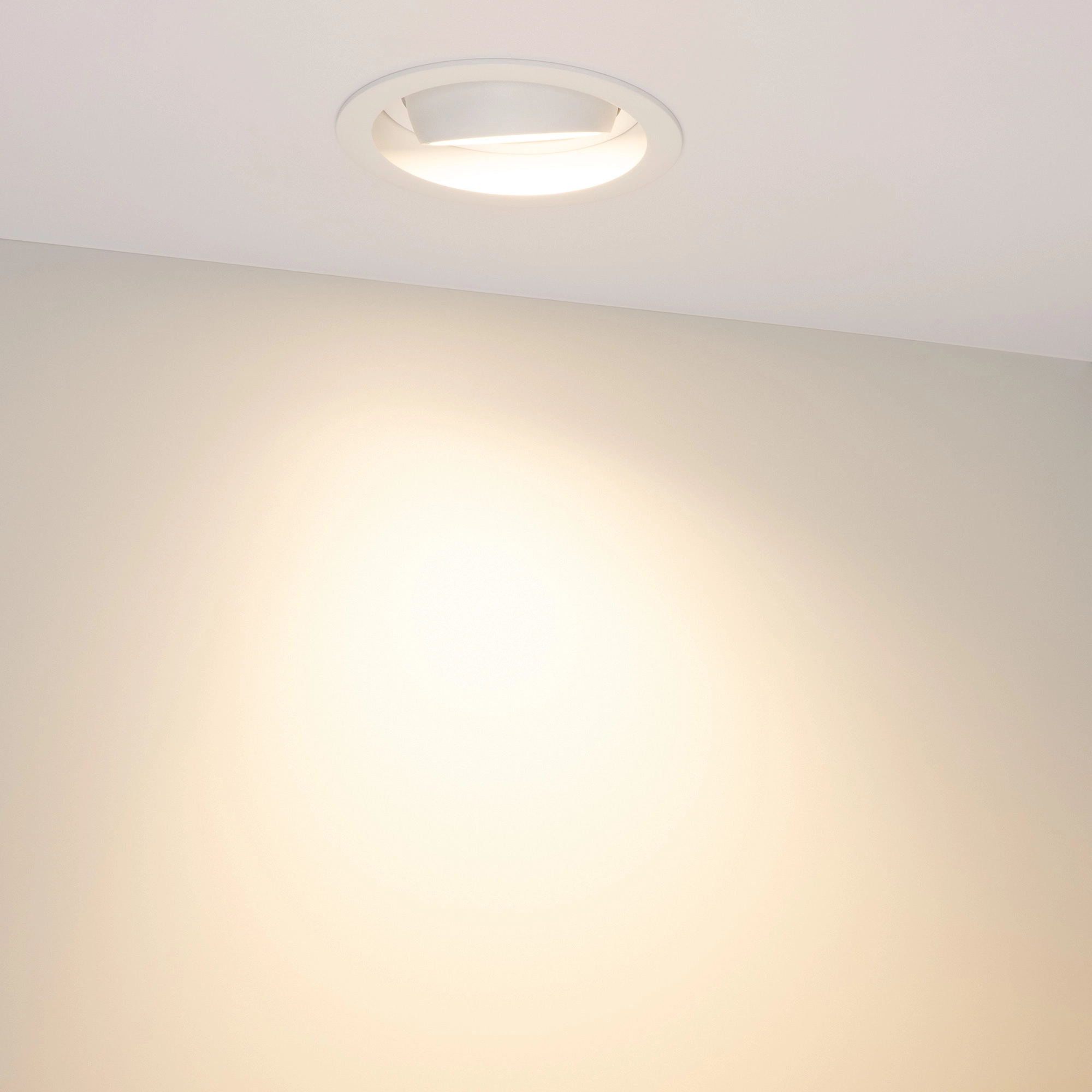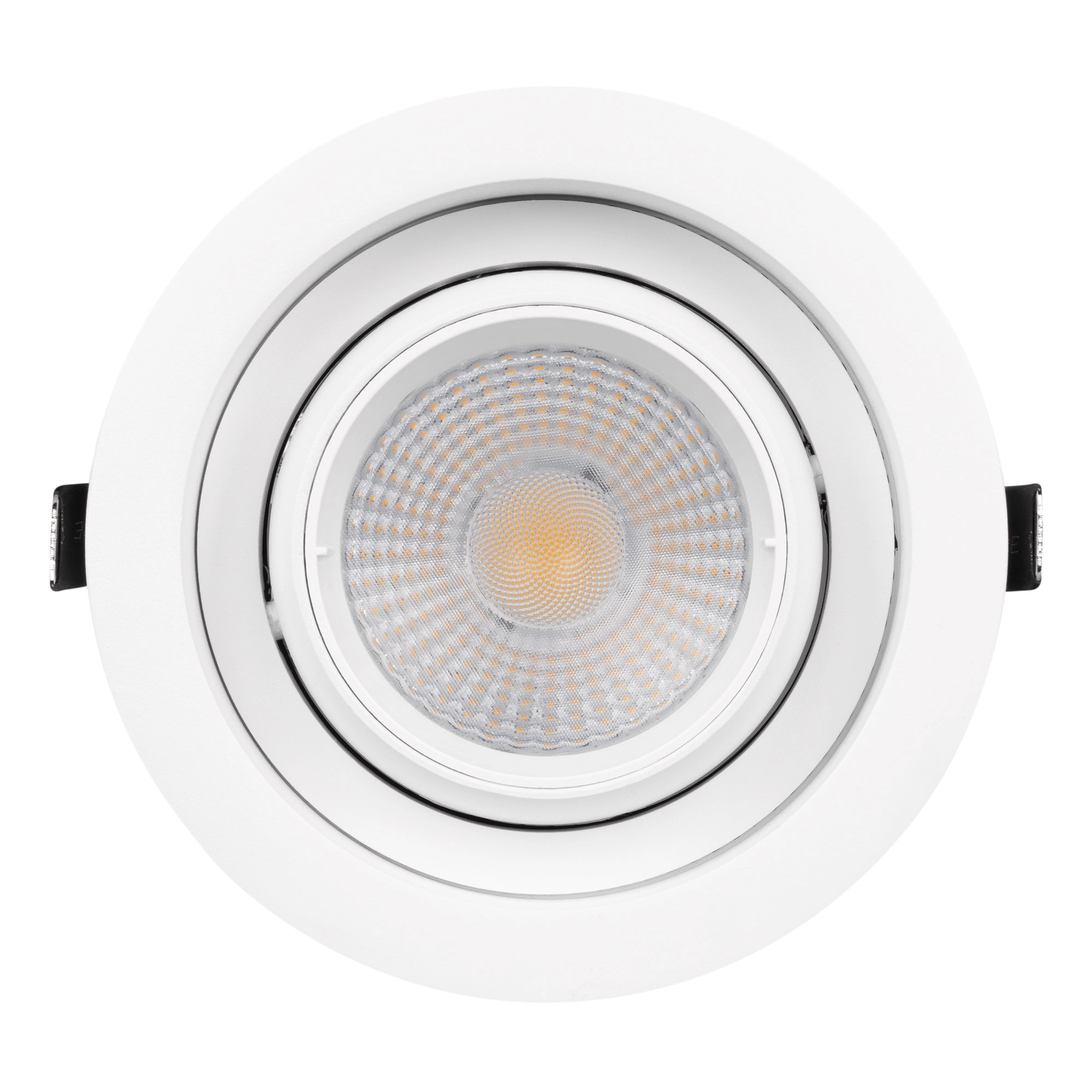 Встраиваемый карданный светильник. Мощность 30 Вт, св. поток 2650 лм, 89 лм/Вт, тёплый 3000 K, CRI>92, угол 50°, напряжение питания 230 В. Белый корпус из алюминия, белая вставка, степень защиты IP20. Размер: диаметр 135 мм, высота 125 мм. Монтаж встраиваемый, установочное отверстие: диаметр 120 мм. Драйвер 24-42 В, 750 мА, пульсация <2%.