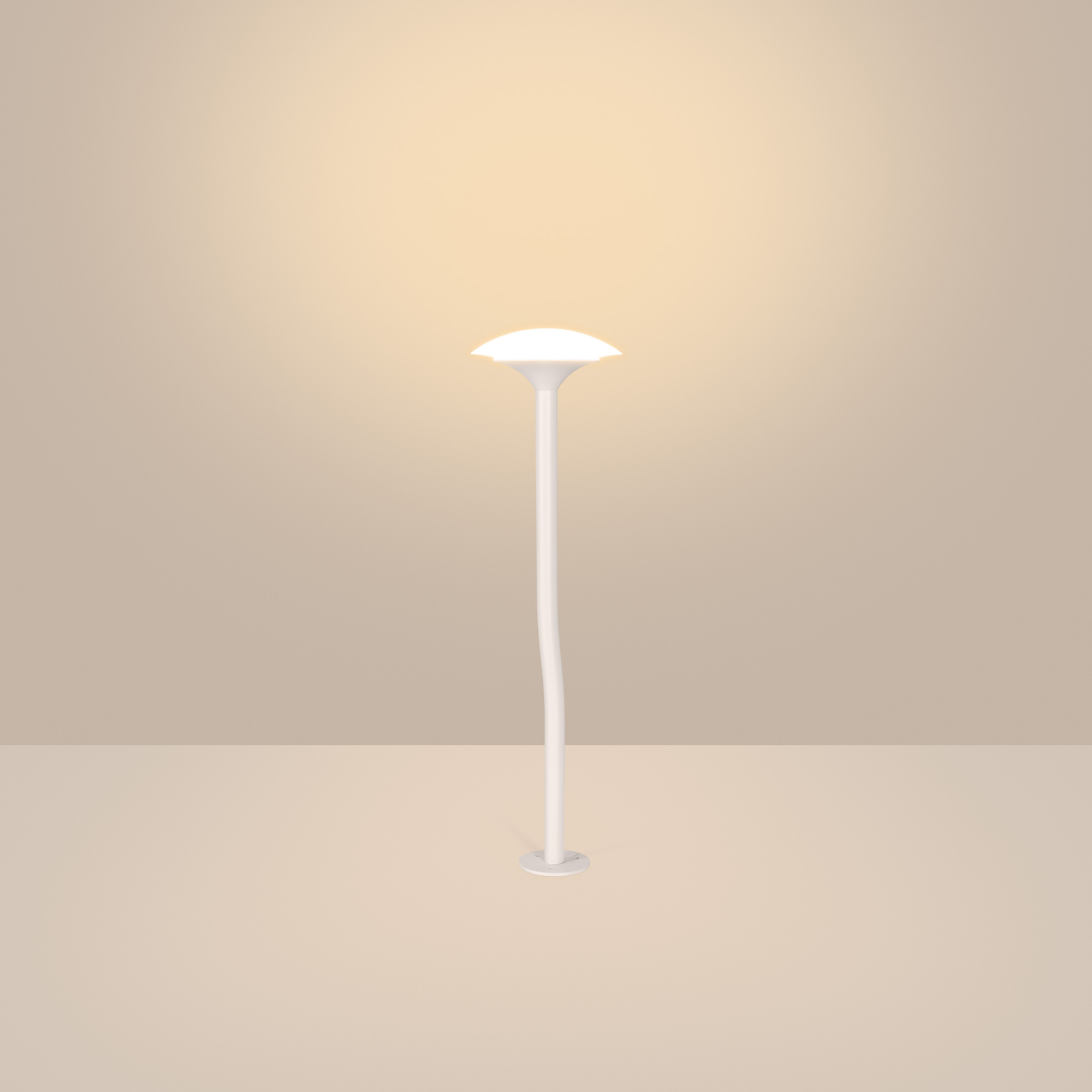 Уличный декоративный светодиодный светильник. Мощность 1 Вт, св. поток 111 лм, 122 лм/Вт, теплый 3000 K, CRI>80, угол излучения 100°, напряжение питания 24 В. Белый корпус из алюминия, прозрачный матовый рассеиватель из PMMA. Степень защиты IP65. Размер: диаметр 58 мм, высота 355 мм, высота углубления 155 мм. Монтаж в грунт с помощью основания пика (входит в комплект поставки).