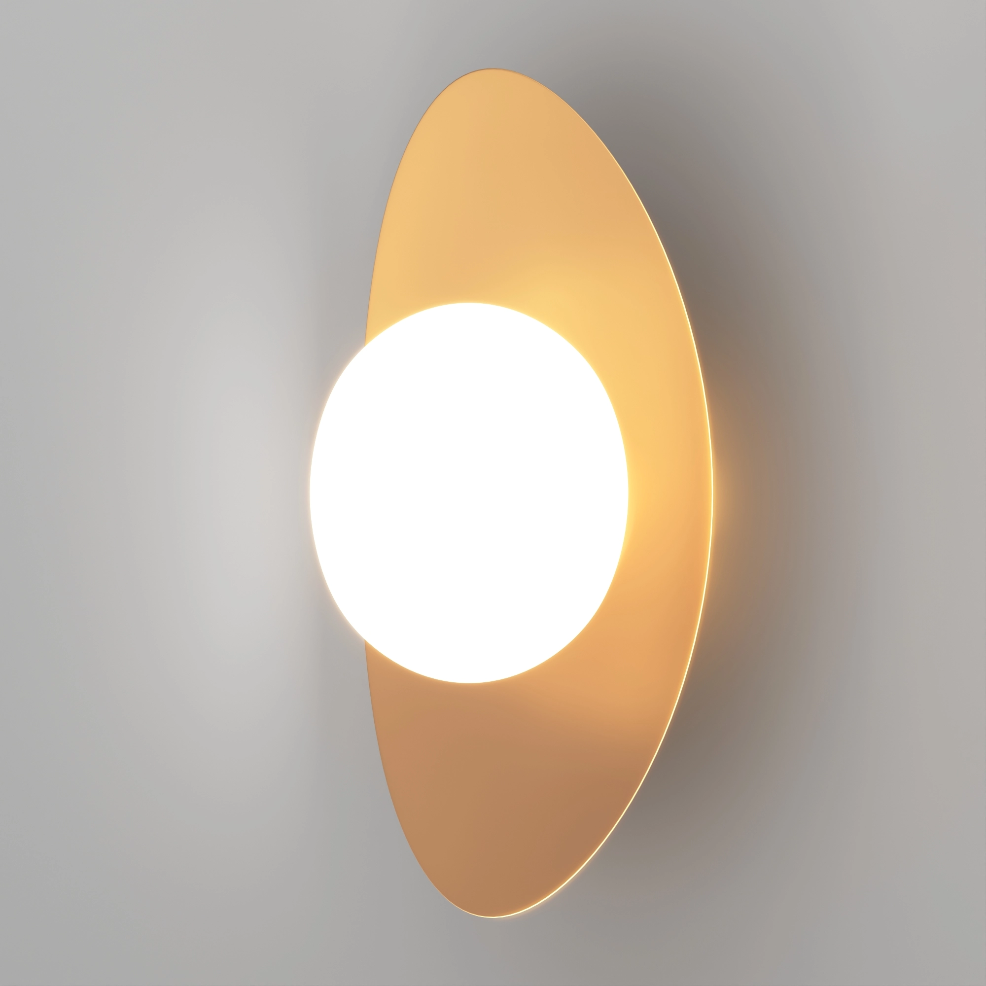 Декоративный настенный светильник. Мощность 6 Вт, св. поток 325-340 лм, 50-52 лм/Вт, теплый 2700 K,теплый 3200К, дневной 4000 K (переключаются), CRI>92, угол 150°, напряжение питания 230 В. Фигурный корпус из  алюминия, гальванизированного в цвет светлое золото, экран из матового стекла, степень защиты IP20. Размер: габариты световой части: Ø145x70 мм, габариты чаши: Ø110 x 42 мм. Монтаж накладной. Встроенный блок питания: 12В DC, 0,75А, пульсация <2%. Встроенный диммер TOUCH-DIM.