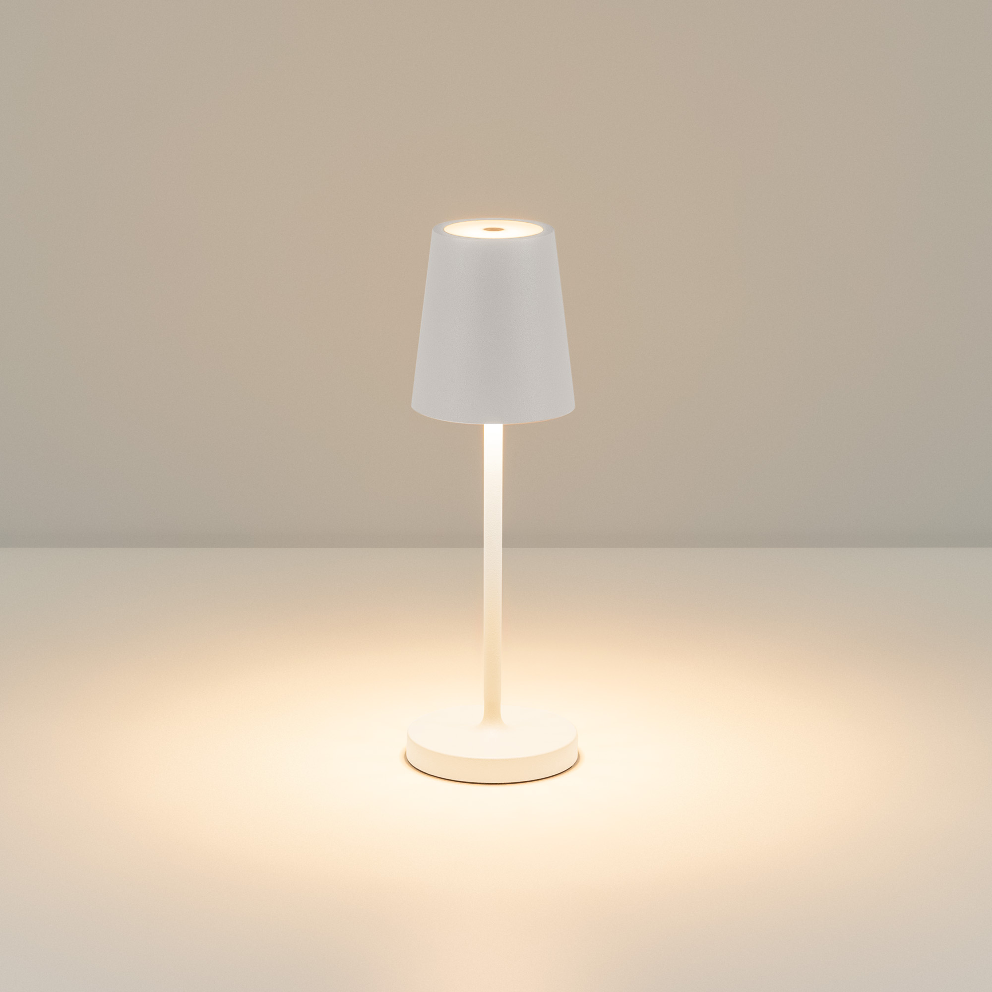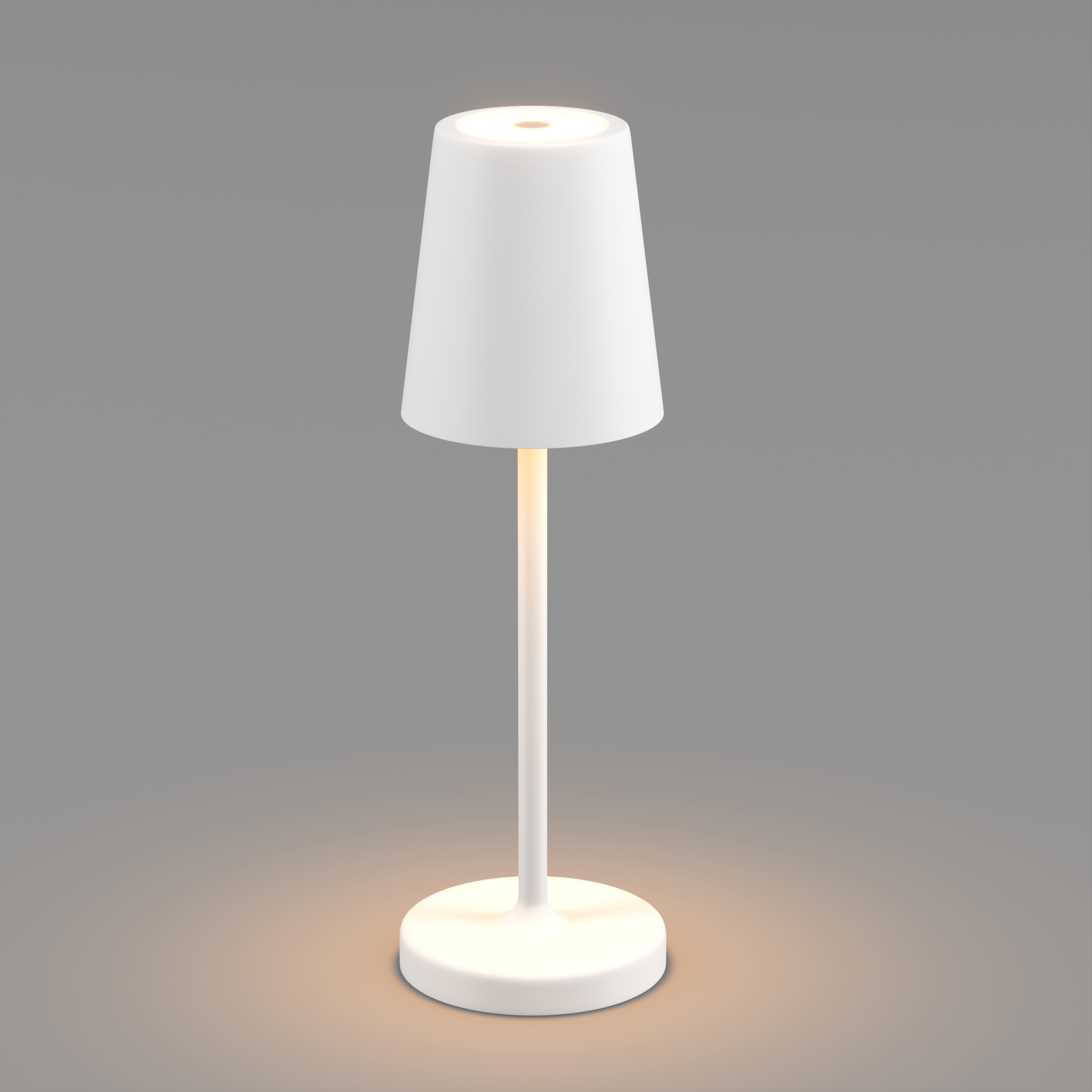 Настольный светильник со встроенным аккумулятором 1.5Вт, алюминиевый корпус, цвет белый. Цвет ТЕПЛЫЙ БЕЛЫЙ 2200-3000K, св.поток 110-130 лм, CRI(Ra)>80, угол 90°. Размер Ф80x250мм. IP54. Зарядка от сети переменного тока AC220-240V. Тип встроенного аккумулятора 1500мАч Li-ion, напряжение батареи 3.7V