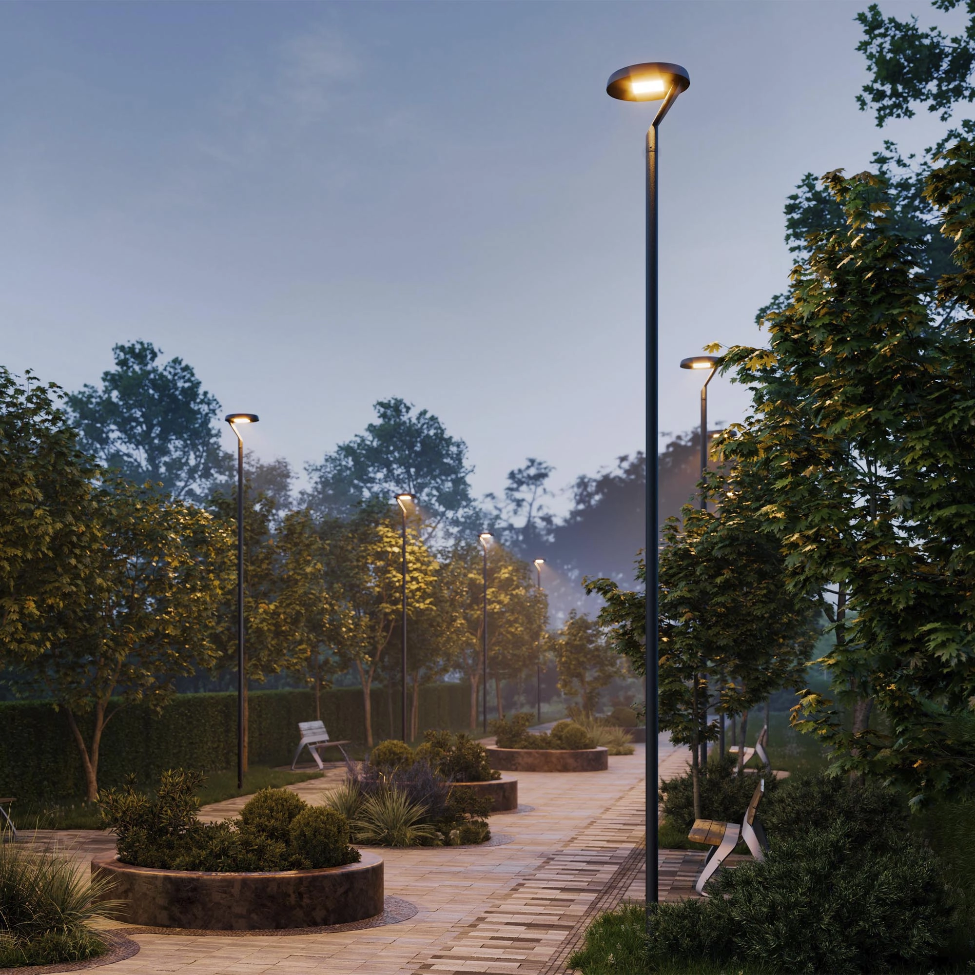 Венчающий светодиодный светильник. Мощность 50 Вт, св. поток 7100 лм, 141 лм/Вт, тёплый 3000 K, CRI>80, угол 145x40°, напряжение питания 230 В. Черный корпус из алюминия, экран стекло, степень защиты IP65. Размер: диаметр 510 мм, высота 480 мм. Монтаж на вертикальную опору диаметром 76 мм.