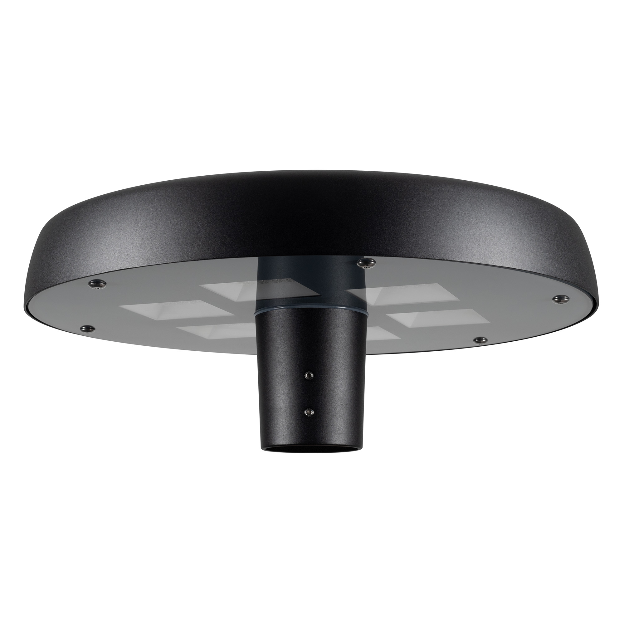 Венчающий светодиодный светильник. Мощность 50 Вт, св. поток 5680 лм, 112 лм/Вт, тёплый 2700 K, CRI>80, угол 140°, напряжение питания 230 В. Черный корпус из алюминия, экран стекло, степень защиты IP65. Размер: диаметр 510 мм, высота 200 мм. Монтаж на вертикальную опору диаметром 76 мм.