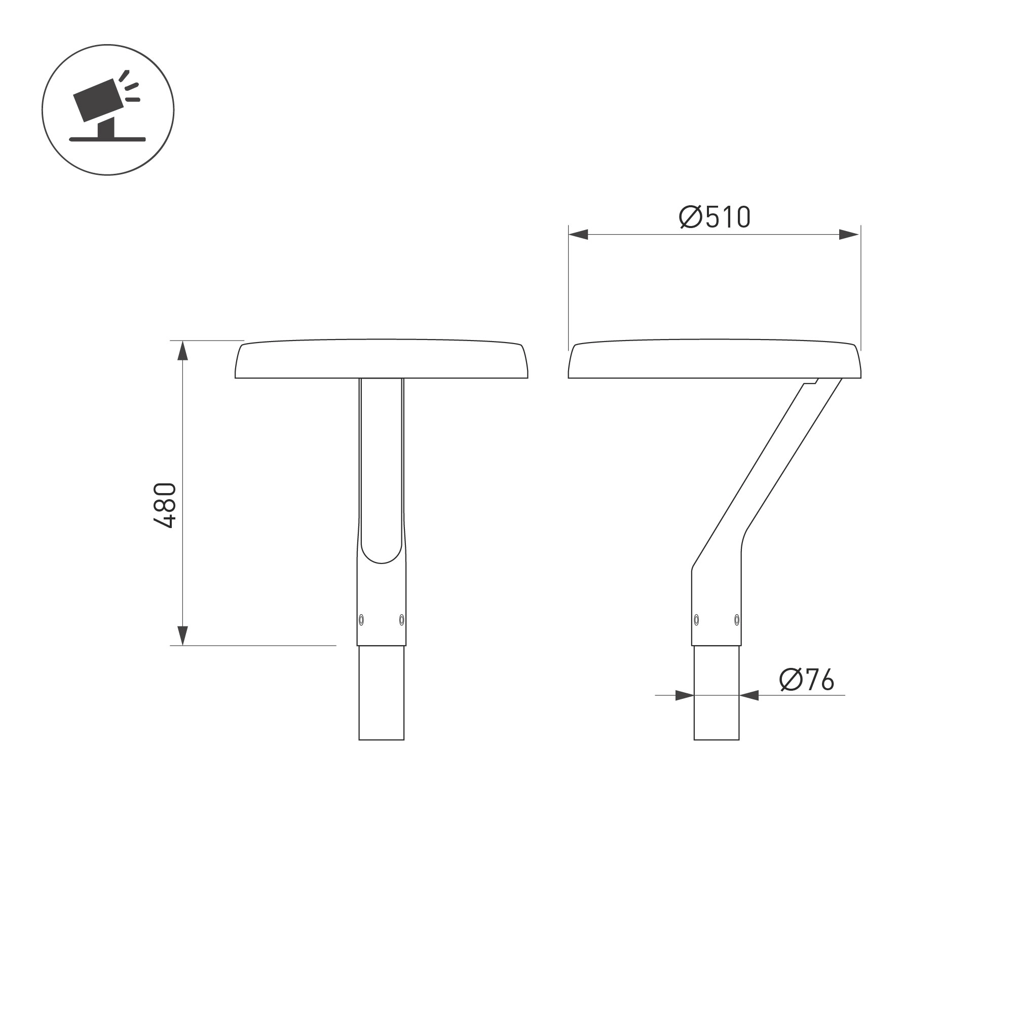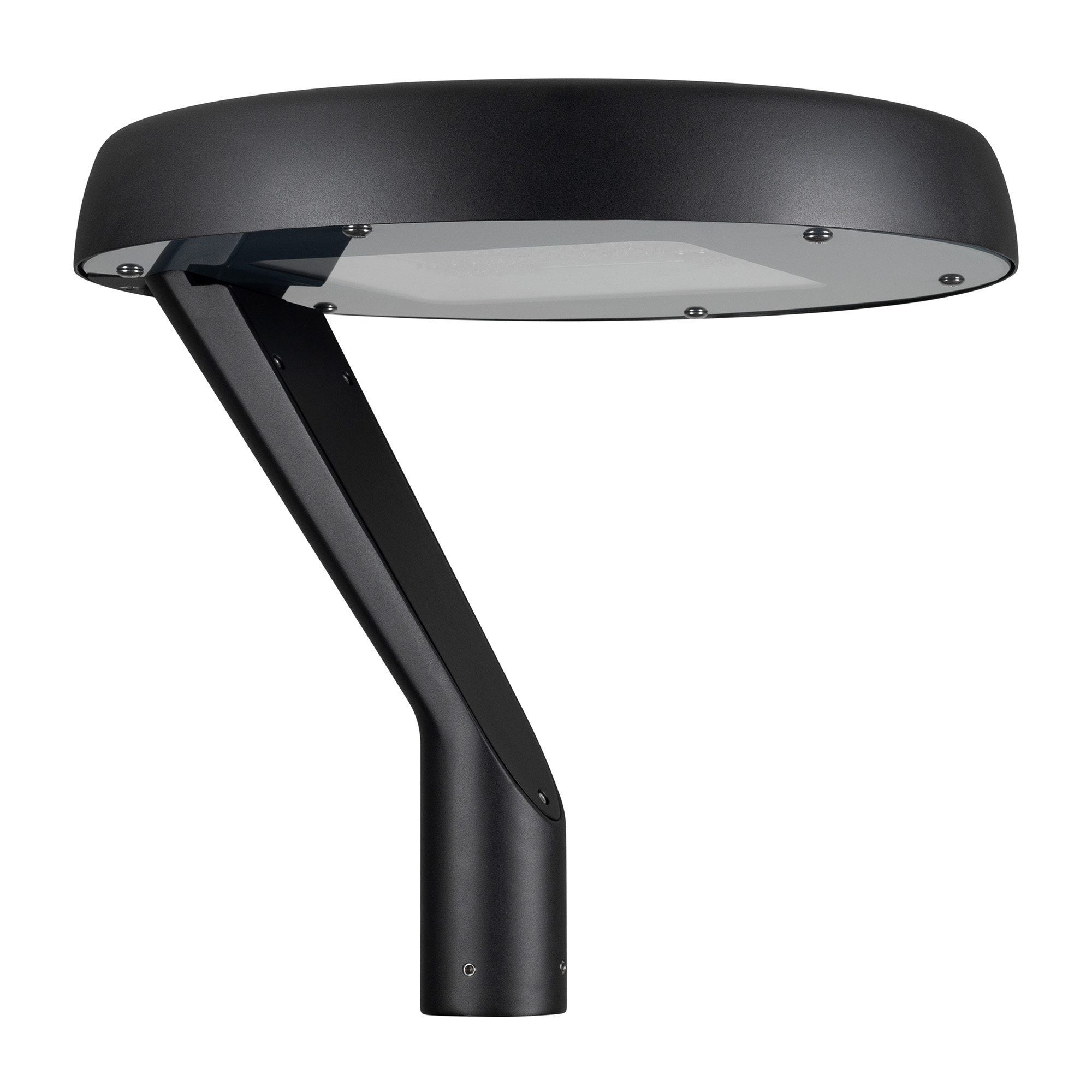 Поставка под заказ от 5 шт. Венчающий светодиодный светильник. Мощность 50 Вт, св. поток 7100 лм, 141 лм/Вт, тёплый 3000 K, CRI>80, угол 145x40°, напряжение питания 230 В. Черный корпус из алюминия, экран стекло, степень защиты IP65. Размер: диаметр 510 мм, высота 480 мм. Монтаж на вертикальную опору диаметром 76 мм.
