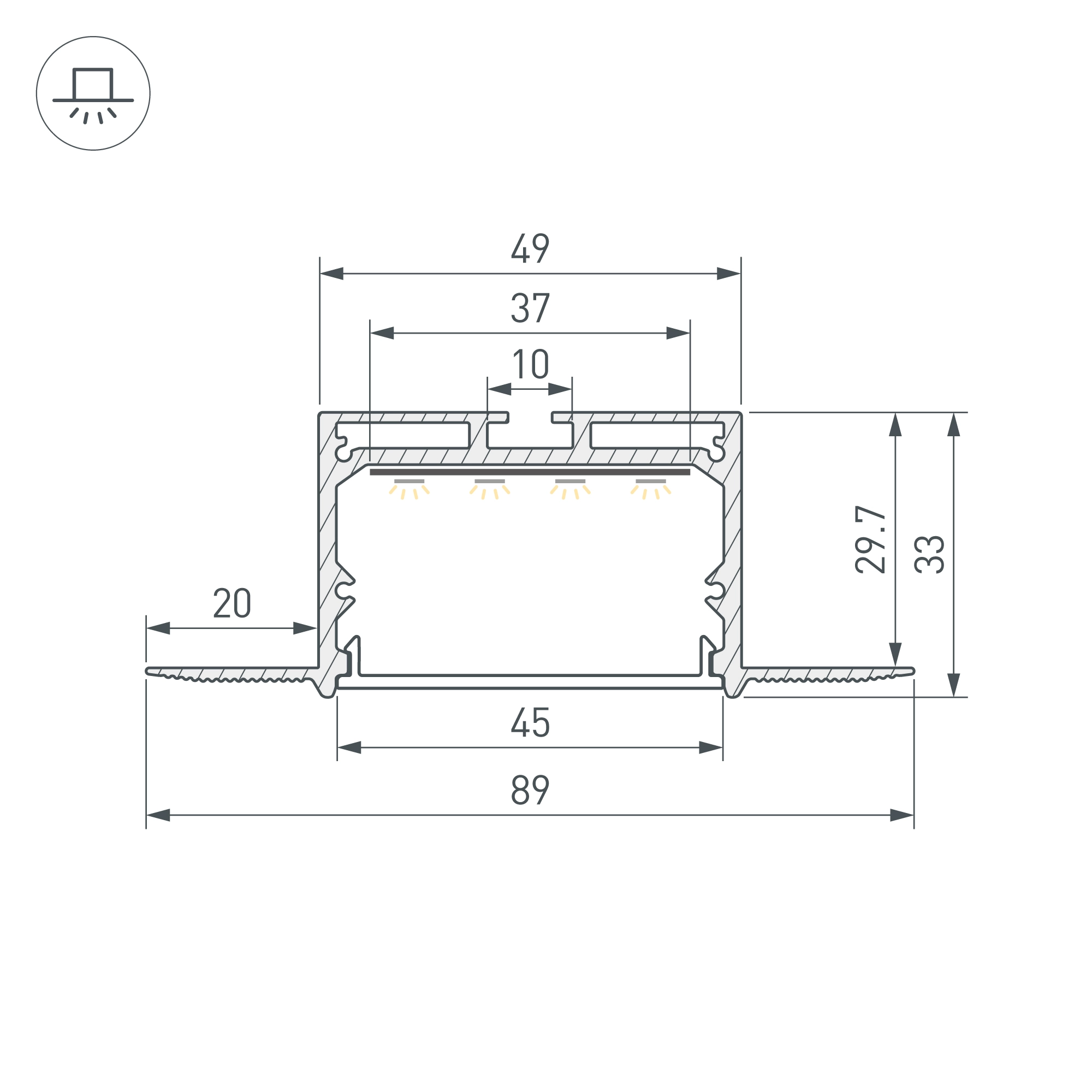 Алюминиевый анодированный профиль для светодиодных лент и линеек. Габаритные размеры (L×W×H): 3000x89x33 мм, паз для установки 49 мм. Ширина площадки для ленты 37 мм. Экраны, заглушки и другие аксессуары приобретаются отдельно. Цена за 1 метр.