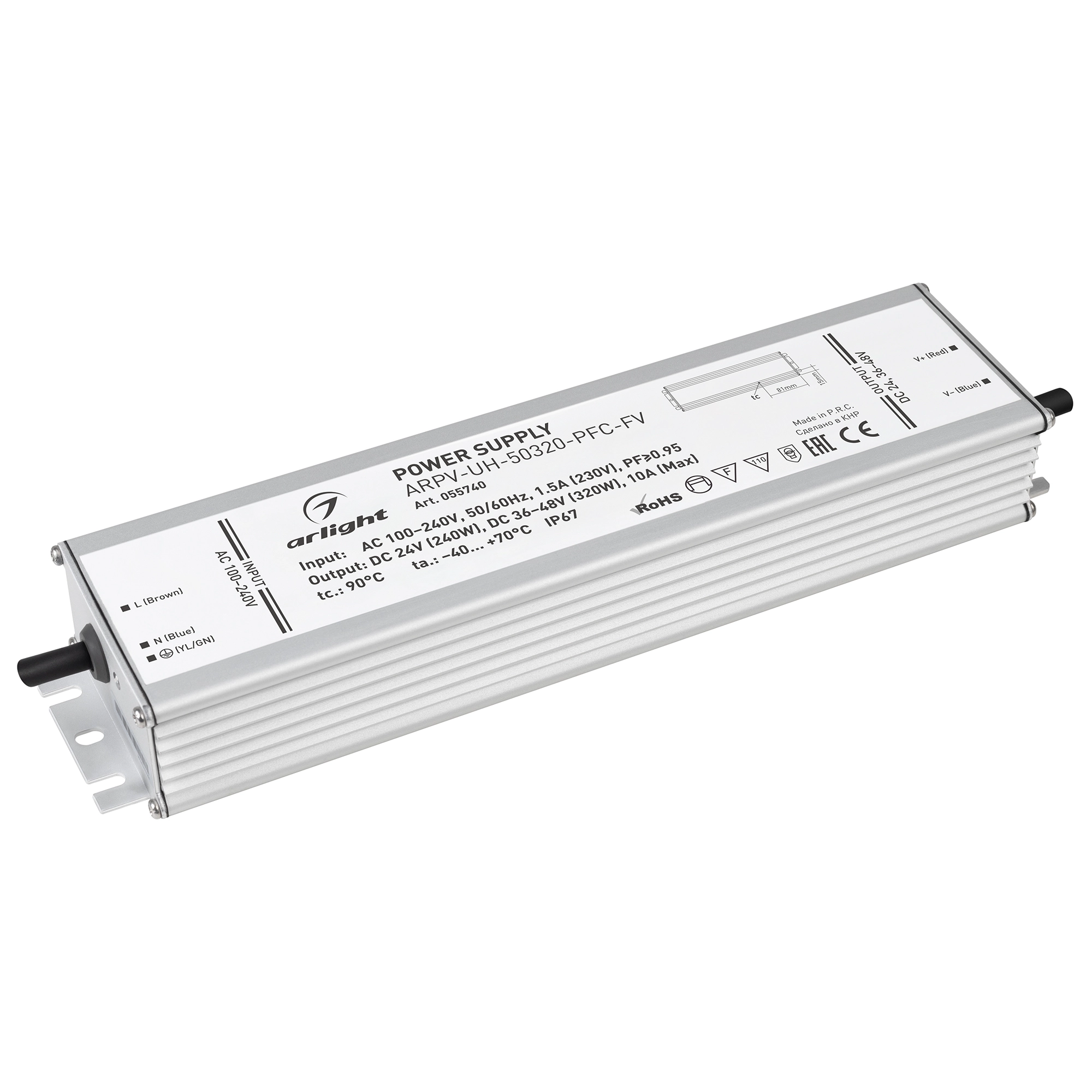 Регулируемый источник напряжения гальванической развязкой для светодиодных изделий. Входное напряжение 100-240 VAC. Выходные параметры: 24В 240Вт, 36-48В 320Вт, 10 А max. Переключение напряжения 24-36-48В с помощью кнопки на корпусе. Подстройка с шагом 0.5В. Встроенный PFC >0,95. Герметичный алюминиевый корпус IP 67. Рабочая температура -40…+70C⁰. Габаритные размеры длина 281 мм, ширина 68 мм, высота 38.5 мм. Гарантийный срок 7 лет.