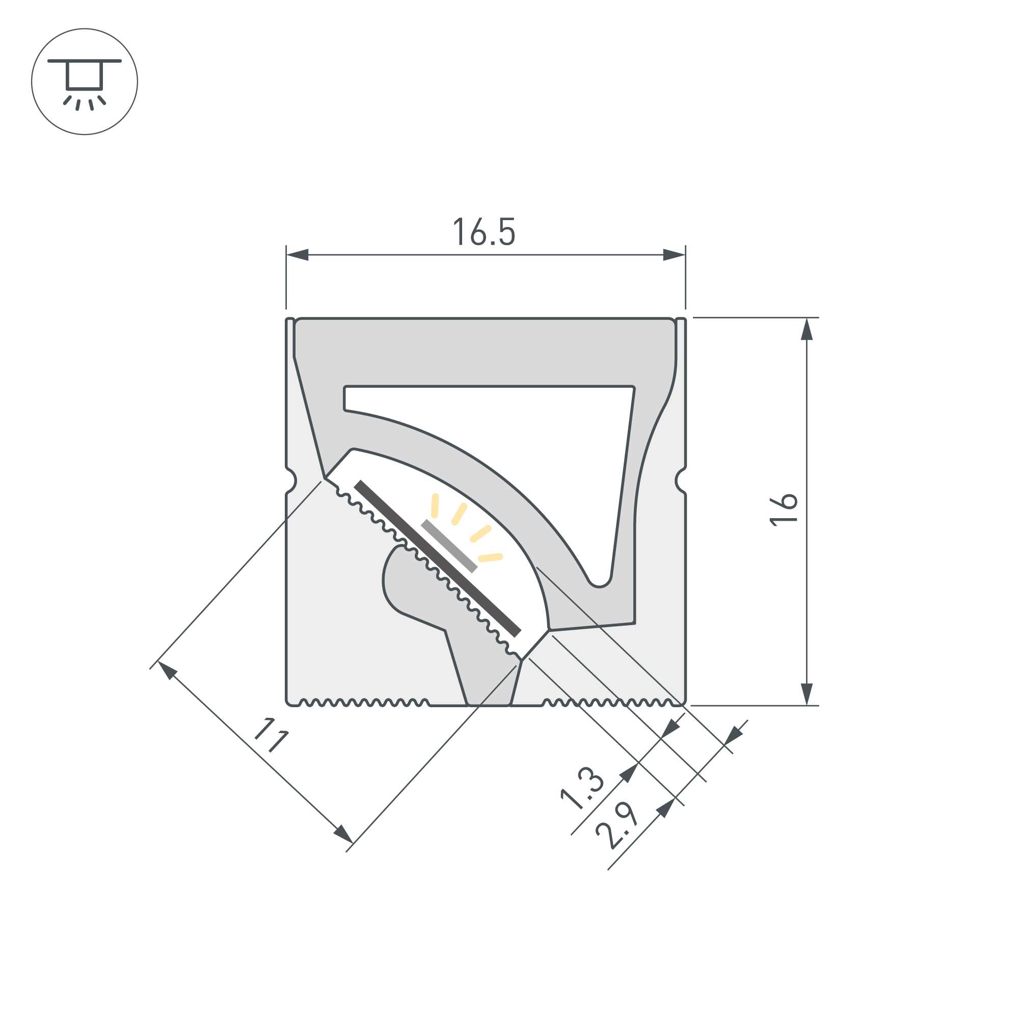 Цельнолитой силиконовый гибкий профиль, белый матовый. Габаритные размеры 10000×16×16 мм. Вертикальный изгиб TOP, минимальный радиус изгиба 50 мм. Горизонтальный изгиб SIDE, минимальный радиус изгиба 200 мм. Для установки во влажных помещениях необходима герметизация при помощи двухкомпонентного эпоксидного герметика. Класс пылевлагозащиты – IP65 (при соблюдении технологии герметизации). Для лент шириной 10 мм, высотой до 2,8 мм и мощностью до 10 Вт/м. Угол излучения 115°. Поставляется в катушках по 5 м. Цена за 1 м.