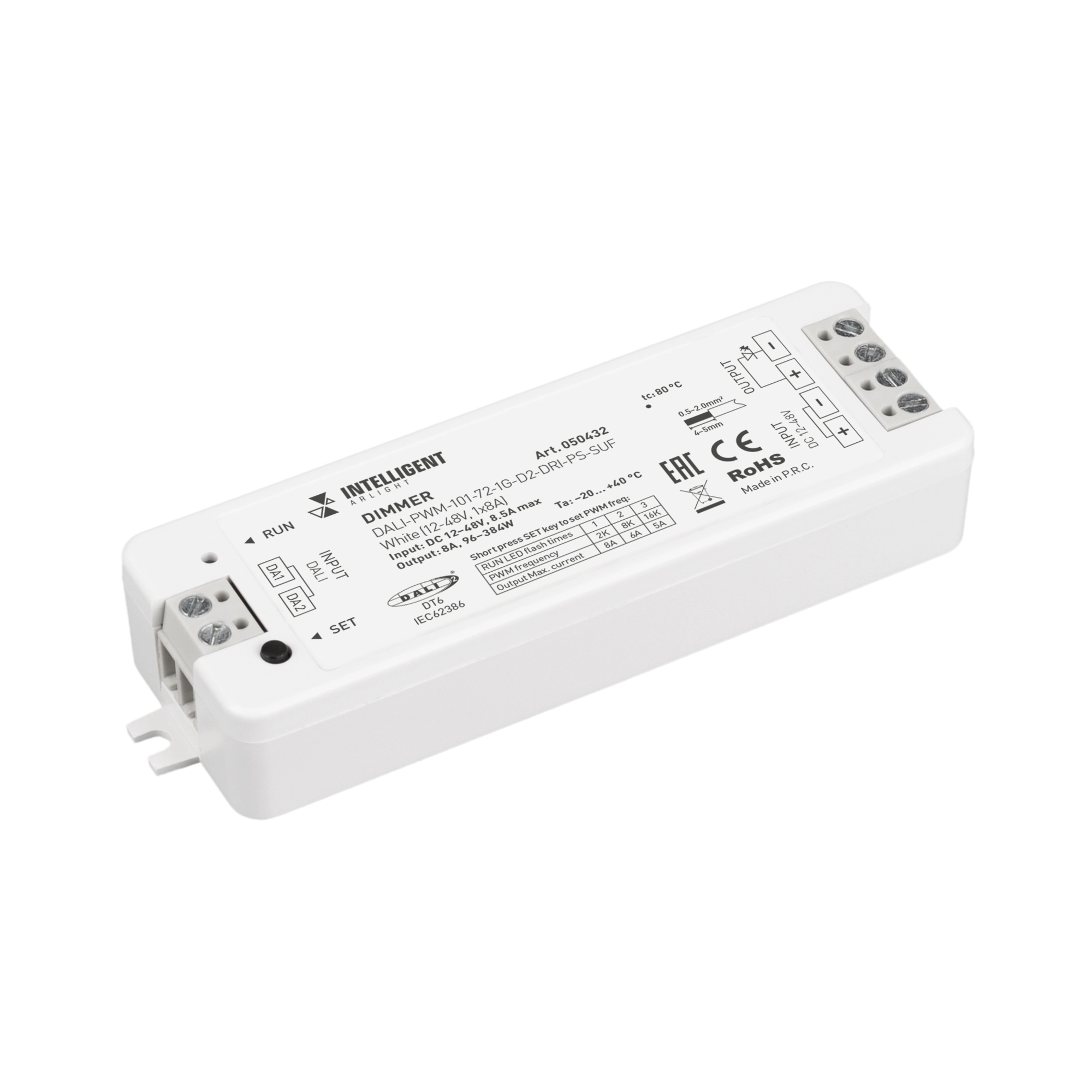 Одноканальный диммер DALI для светодиодных лент. Тип устройства DT6. Частота ШИМ 2000-16000 Гц. Наличие функции Push-Dim. Питание/выход DC 12-48V, ток нагрузки 8А, максимальная суммарная мощность нагрузки 96-384W. Габариты 105.7 х33х18 мм.