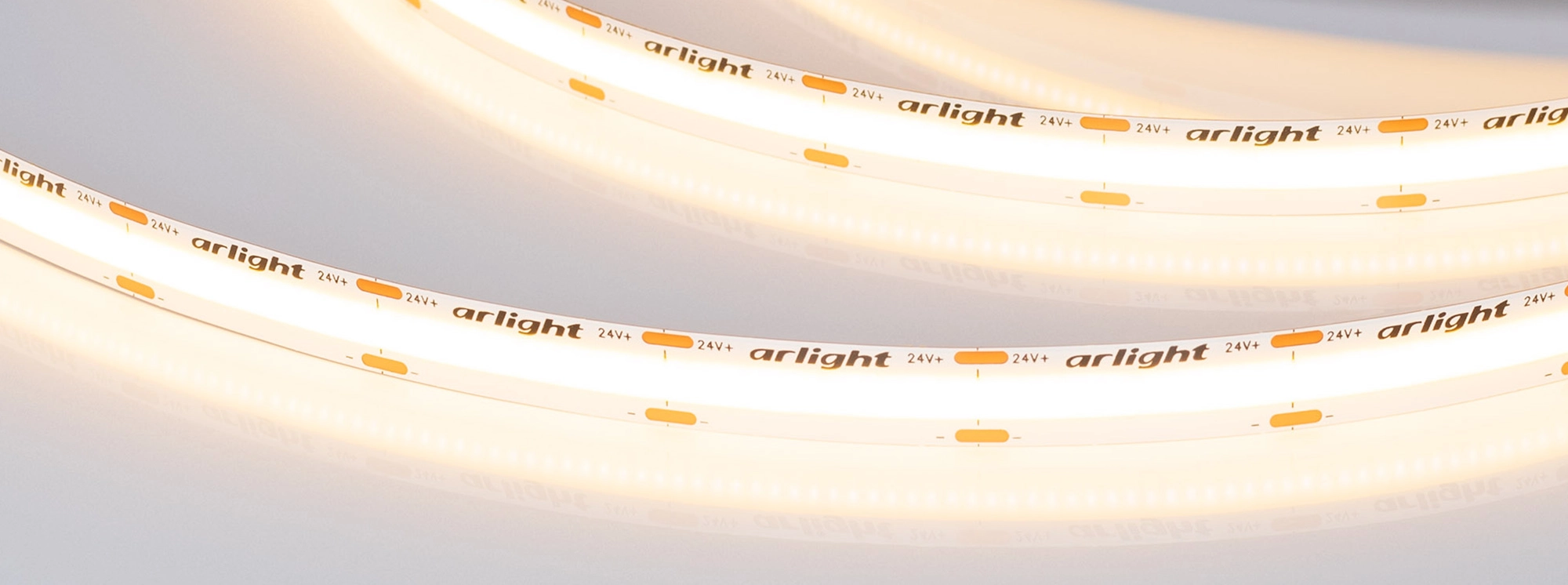 Светодиодная лента сплошного свечения COB серии X576. Светодиоды CSP, 576 шт/м, белая плата шириной 10 мм, скотч 3M. Цвет ТЕПЛЫЙ 2700K, индекс цветопередачи CRI>90, угол 170°. Питание 24 В, мощность 15 Вт/м (75 Вт на 5 м). Размеры 5000x10x1.8 мм. Мин. отрезок 27.8 мм. Цена за 1 м. Обязательна установка на профиль.