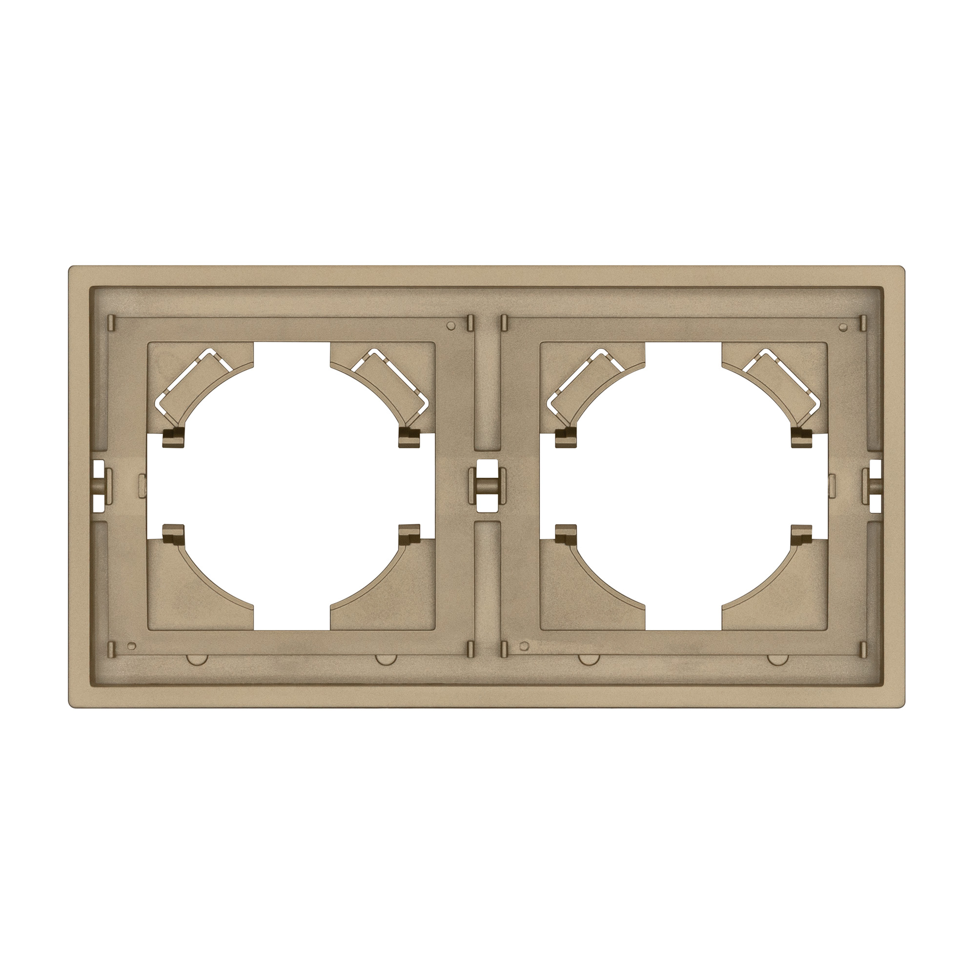Рамка пластиковая на 2 поста, под встраиваемый механизм. Цвет - золотой, с Soft-Touch покрытием.  Среднего уровня герметичности IP20. Ориентация монтажа горизонтальная.