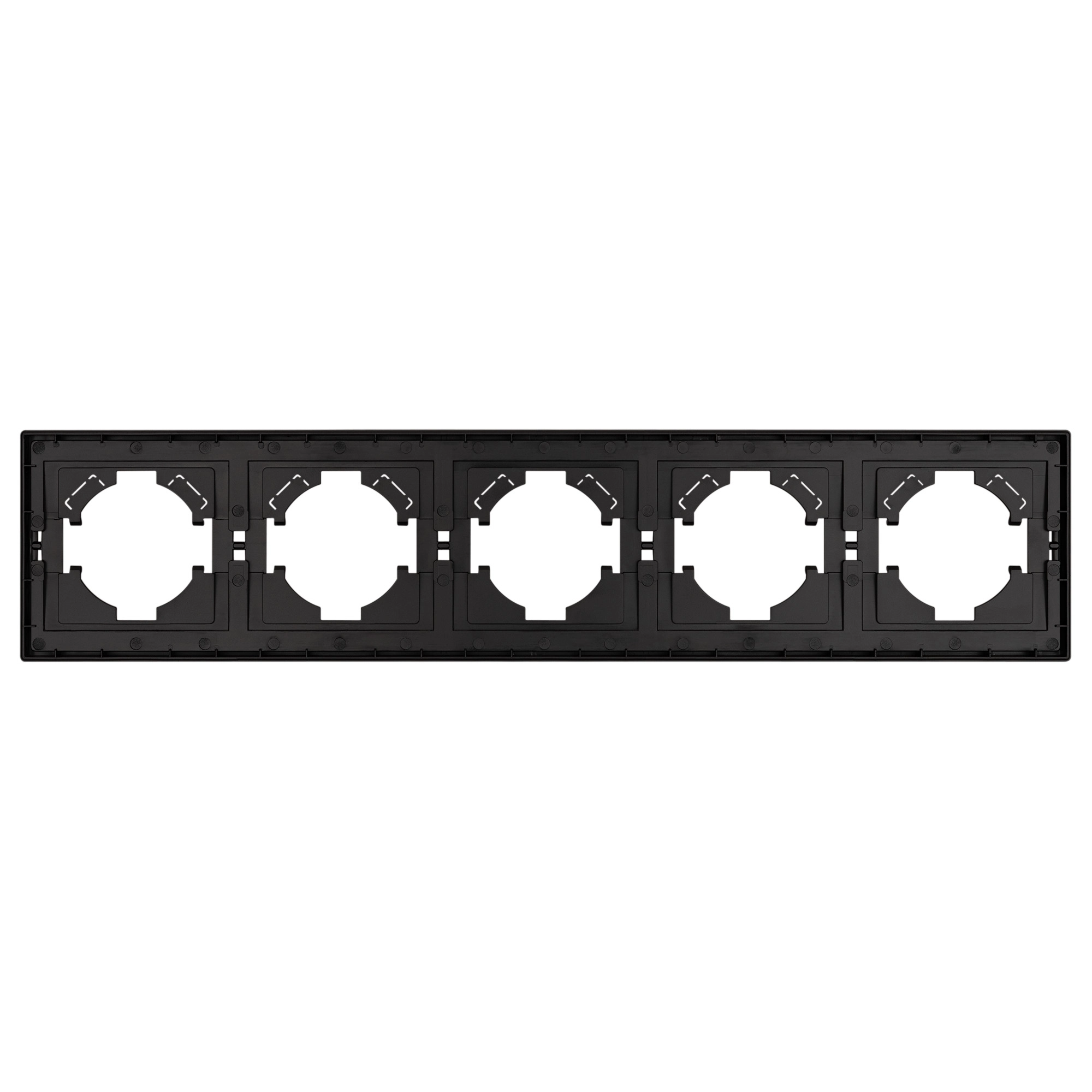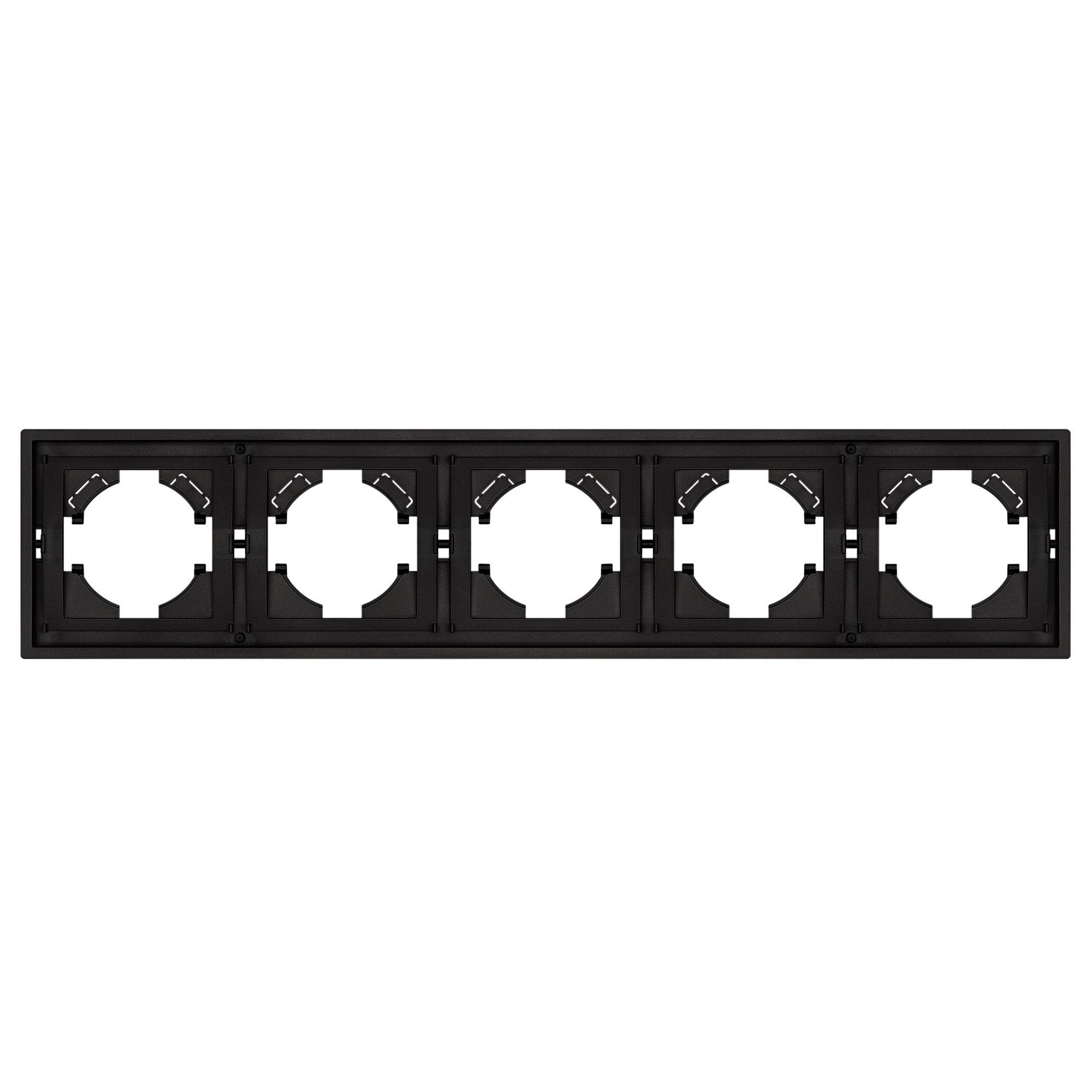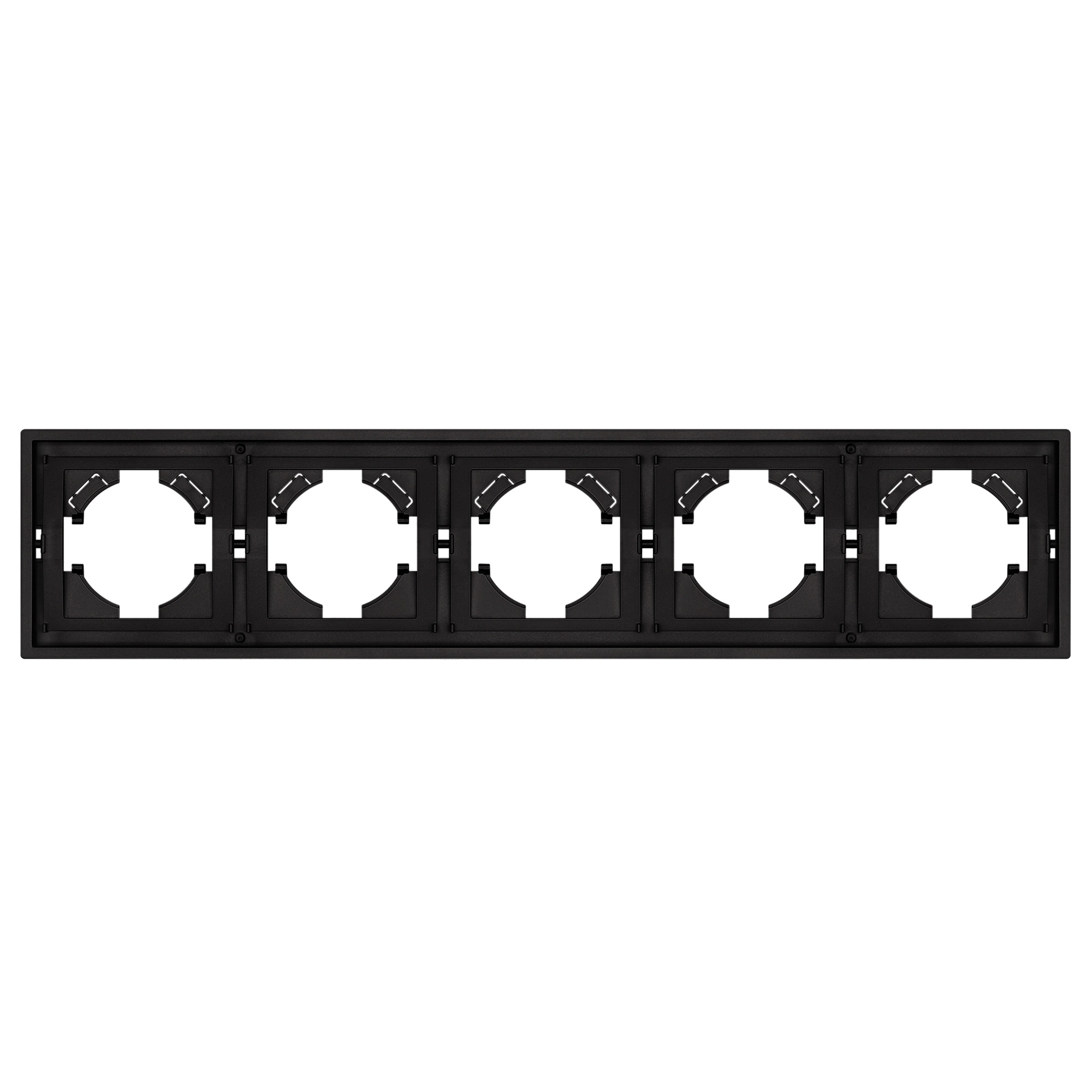 Рамка пластиковая на 5 постов, под встраиваемый механизм. Цвет - черный, с Soft-Touch покрытием.  Среднего уровня герметичности IP20. Ориентация монтажа горизонтальная.