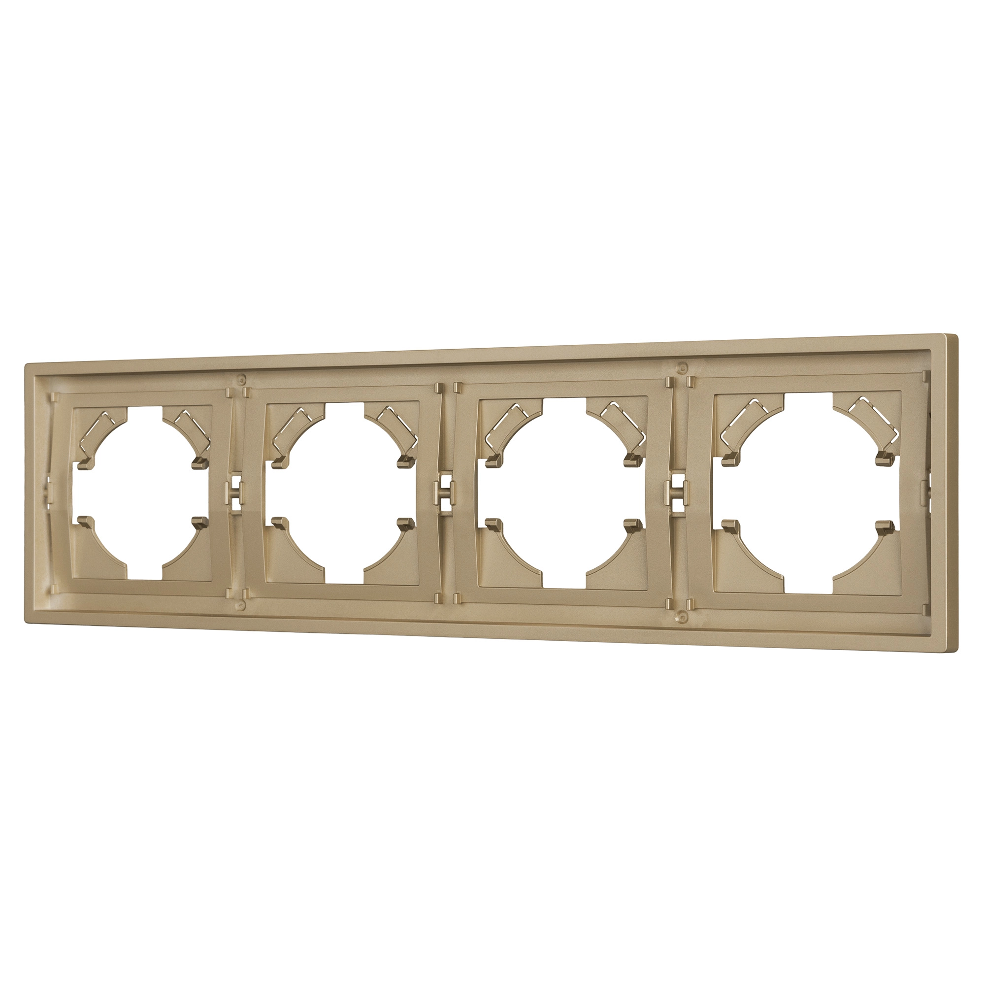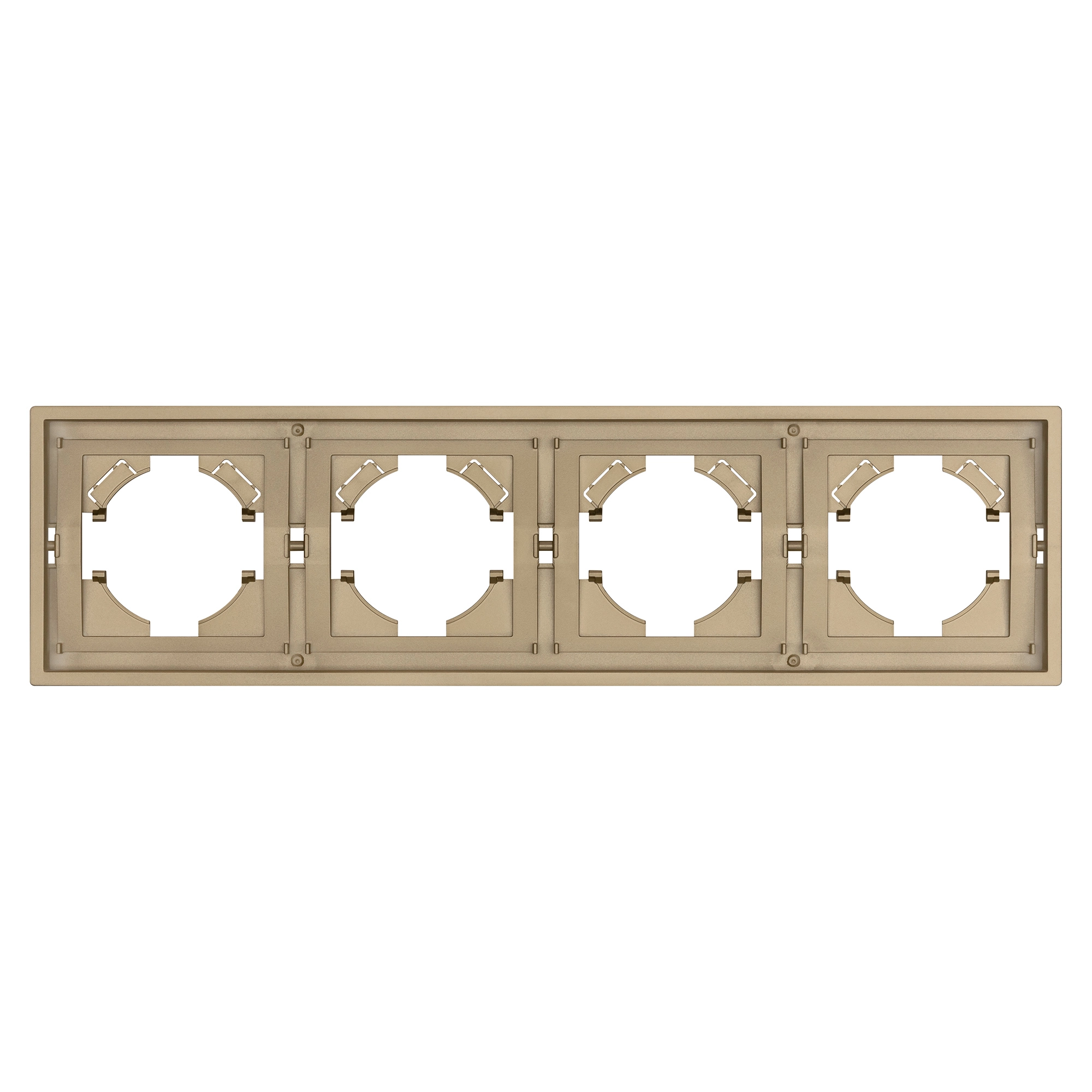 Рамка пластиковая на 4 поста, под встраиваемый механизм. Цвет - золотой, с Soft-Touch покрытием.  Среднего уровня герметичности IP20. Ориентация монтажа горизонтальная.
